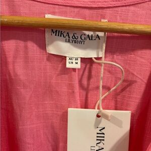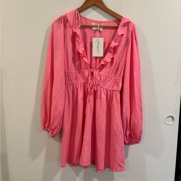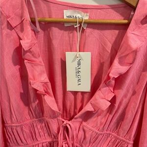 Elegant pink midi dress with ruffled neckline and tie detail. Perfect for any occasion.
