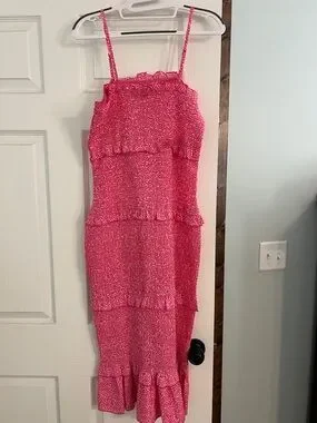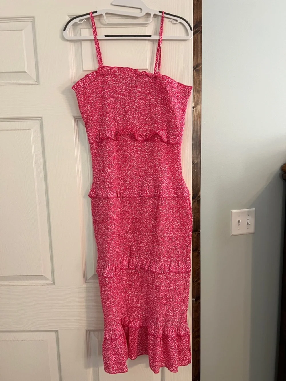 Sleeveless pink midi dress with thin straps. All-over small floral or dotted print. Soft ruffle tiers and hem for a feminine look. Lightweight and flattering silhouette.