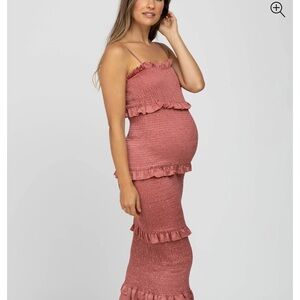 Elegant pink midi dress with ruffle details. Perfect for any occasion.