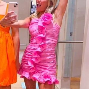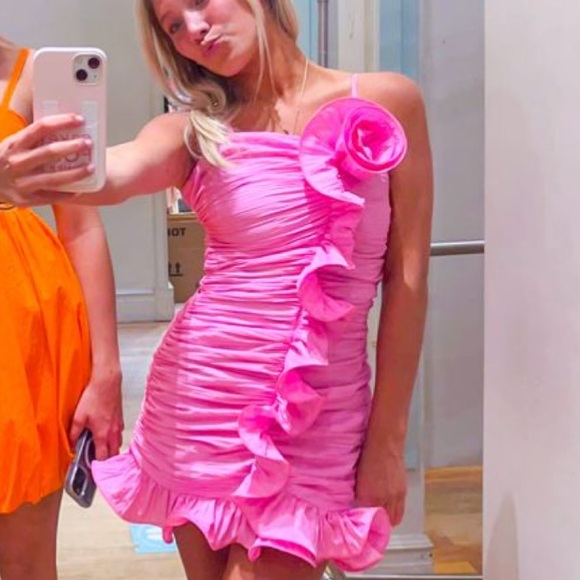 Chic pink mini dress with ruffled details. Perfect for parties. Adjustable straps!