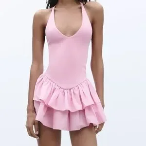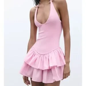 Chic pink mini dress with ruffled skirt. Perfect for a stylish outing. NEVER WORN