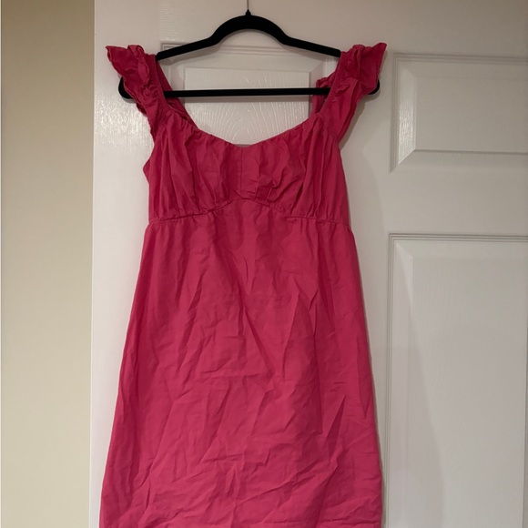 Chic and stylish pink mini dress with ruffled sleeves. Perfect for any occasion.