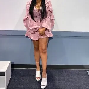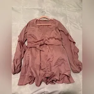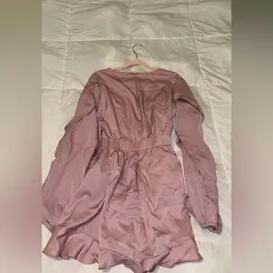 Chic pink mini romper with ruffled sleeves originally from fashion nova! I used a safety pin to keep the chest more modest. It looked like this on me at 5’6, 175 lbs, 38F band & breast cup for reference! x
