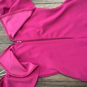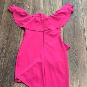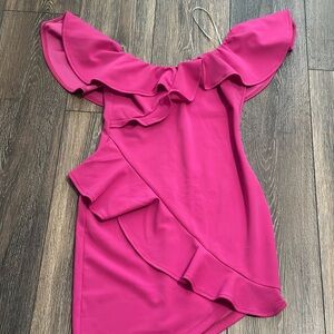 Stylish pink off-shoulder dress with ruffle details. Perfect for a chic look or date night.