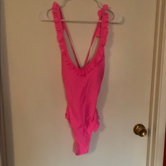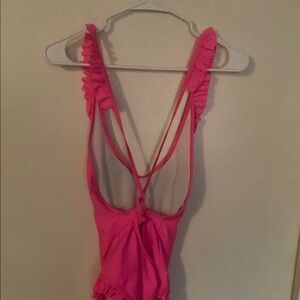 Stylish pink one-piece swimsuit with ruffled details. Perfect for a chic beach look.
