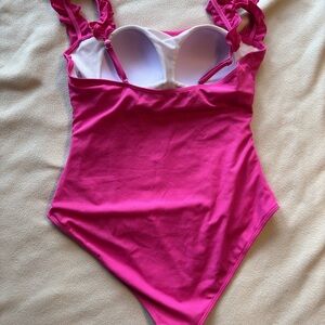 Stylish pink one-piece swimsuit with ruffled straps. Perfect for a beach day.
