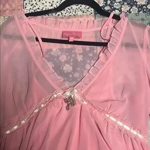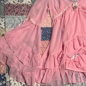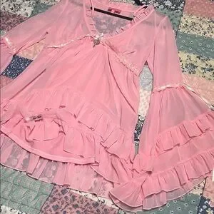 Soft pink sheer blouse with layered ruffle hem. V-neck with delicate ribbon and charm detail. Long flared sleeves with ruffle trim. Feminine, flowy silhouette. Perfect for dressing up or layering.