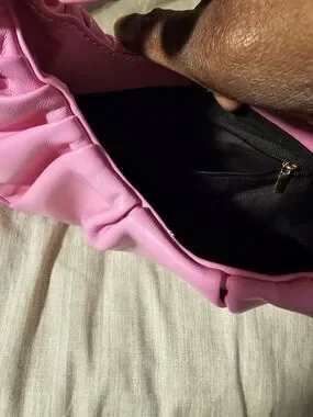 Soft pink ruffled shoulder bag. Black interior with zip pocket. Elegant, playful silhouette. Perfect for everyday or evening wear.