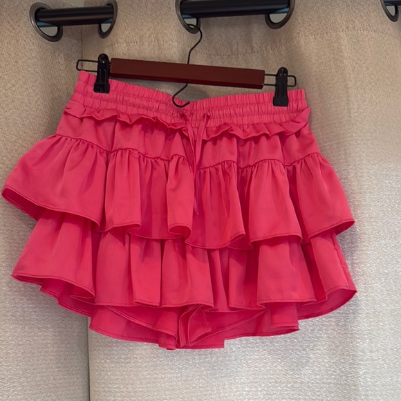 Chic pink ruffled skirt. Perfect for a fun and flirty look. Elastic waistband for comfort.