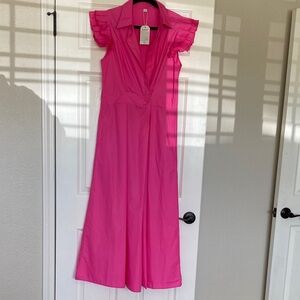 Stylish pink dress with ruffled sleeves. Perfect for any occasion. Pockets! 54.5 inches shoulder to hem.