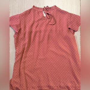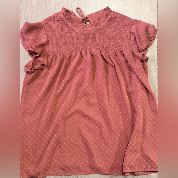 Charming pink top with ruffled sleeves. Features a textured pattern.
