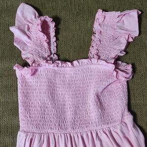 Charming pink sun dress with ruffled straps. Perfect for any occasion.