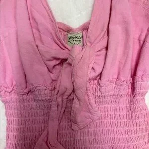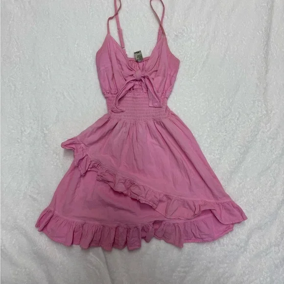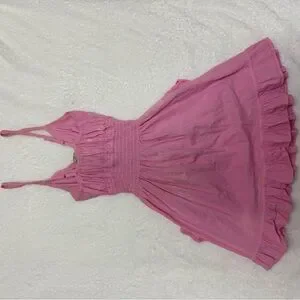 Charming pink sundress with ruffled details. Perfect for a sunny day.