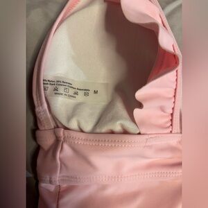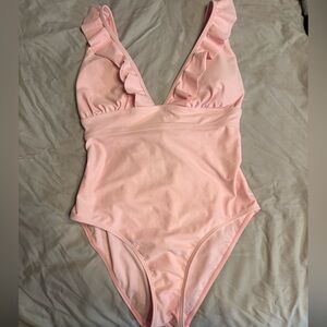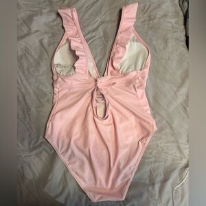 Stylish pink swimsuit with ruffled details. Perfect for a chic beach look.