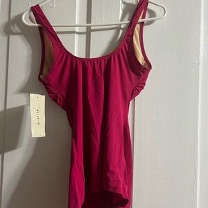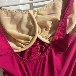 Chic pink swimsuit top with elegant ruffle details. Vneck front and scooped neck back. Built in underwire bra. Perfect for a stylish beach day.
