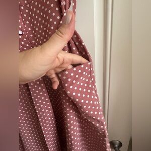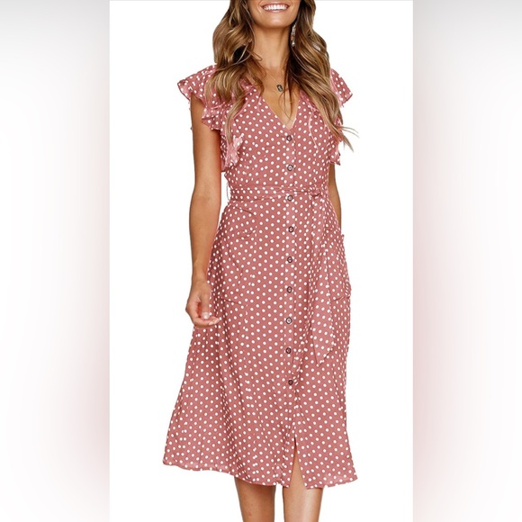 This charming sundress features a v-neckline and flutter cap sleeves, perfect for casual or resort wear. The pink and cream color palette adds a touch of elegance, while the tie front detail enhances its feminine appeal.