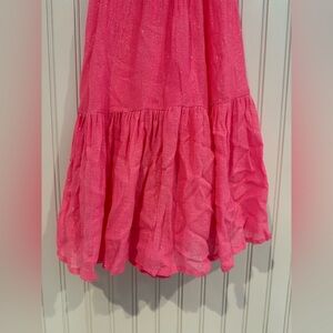 This sleeveless sundress in a delightful pink shade showcases a halter neckline and a tiered, ruffled design, perfect for casual outings or resort wear. Its lightweight fabric offers a breezy and comfortable fit, ideal for warm, sunny days.