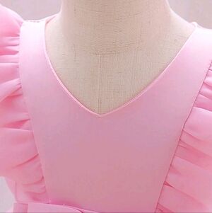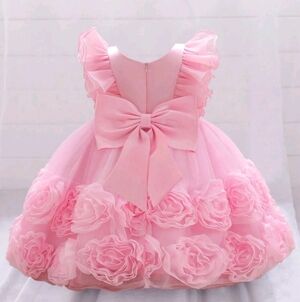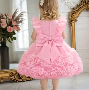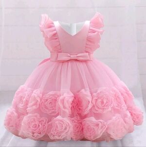 Adorable pink toddler dress with ruffled details and floral accents. Perfect for special occasions.