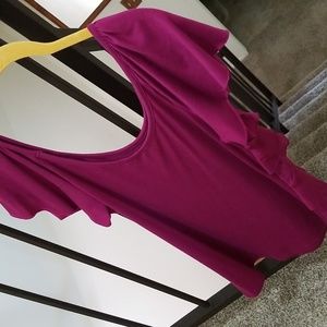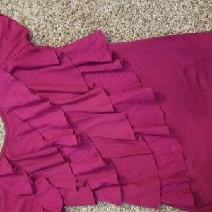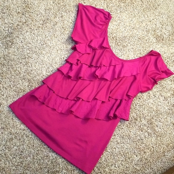 This is a scooped neck, short sleeved ruffled top. The color is a magenta or pink tone. This top has five layers of gorgeous ruffles. It measures about 30" from the shoulder to the hem. It can be worn with jeans, a skirt or jeggings.