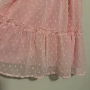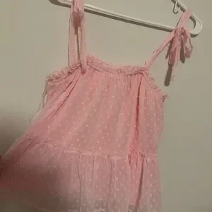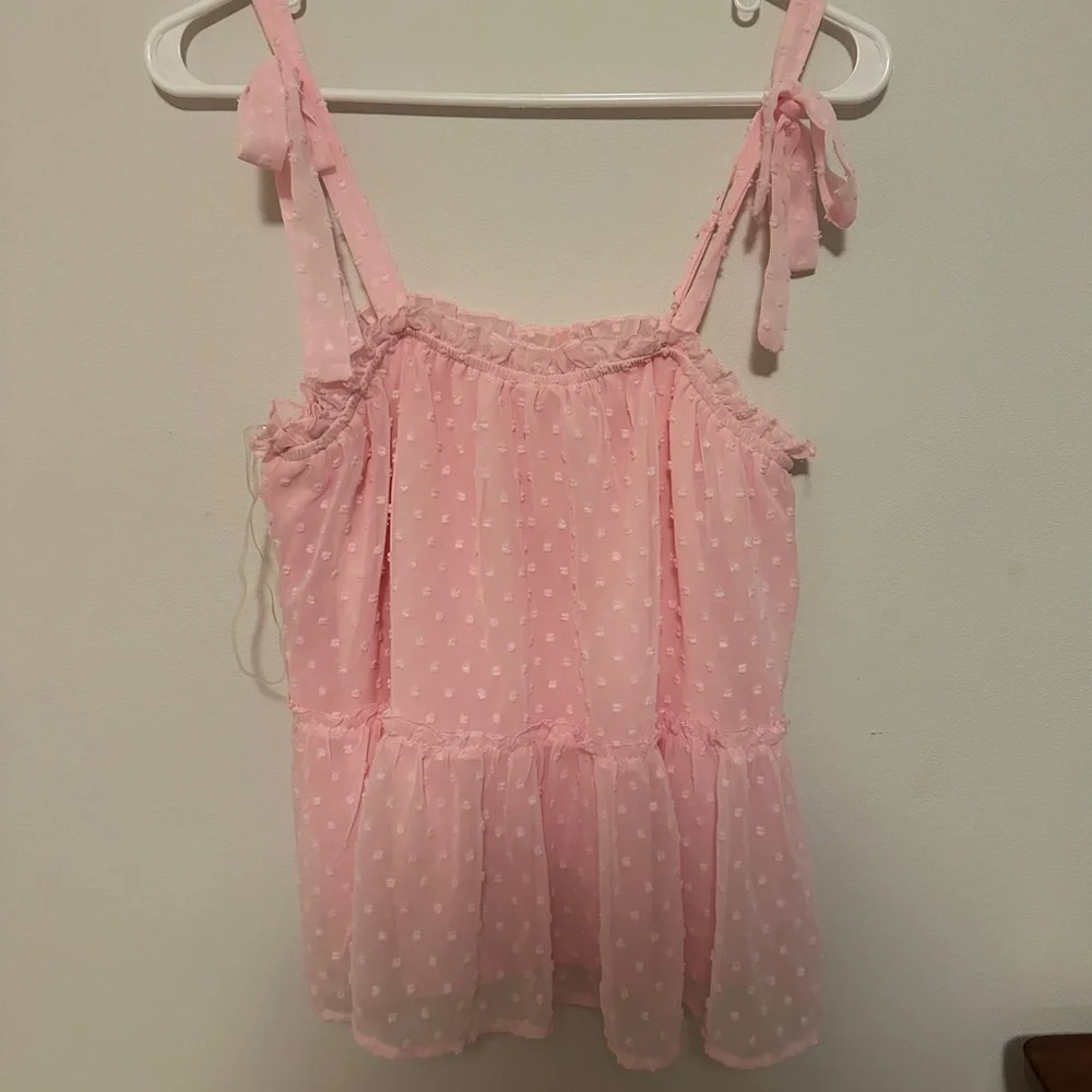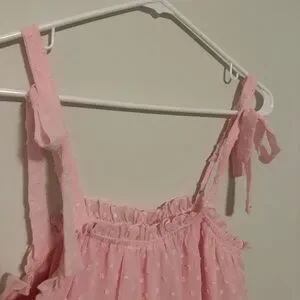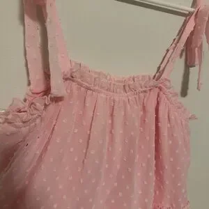 Super cute pink tank top with polka dot pattern. Features ruffled details and tie straps! Like new from Altar’d State.