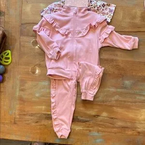 Adorable pink tracksuit with ruffle details. Includes a zip-up top and matching pants.
