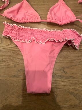 Cute pink two-piece bikini with ruched ruffle trim. Triangle top with adjustable ties. High-cut bottoms with matching ruffle waistband. Soft, playful beach style.