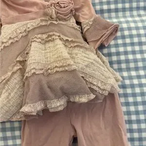 Delicate dusty pink two-piece costume with layered ruffles. Lace accents and rosette detail add charm. Soft fabric for comfortable wear. Playful vintage-inspired silhouette.