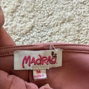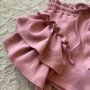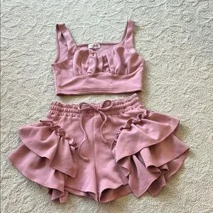 Stylish pink two-piece set with ruffled shorts. Perfect for a chic look.