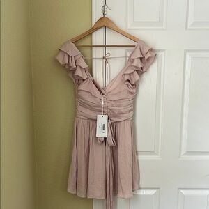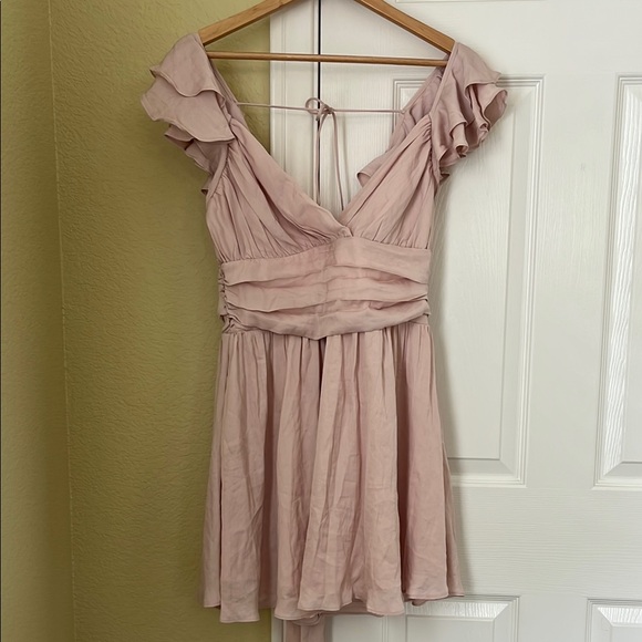 This elegant pink dress features charming ruffled sleeves and a flattering silhouette. Perfect for any occasion, it offers a blend of style and comfort.