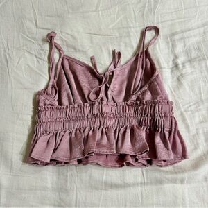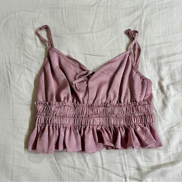 Cute metallic pink ruffled cropped top perfect for going out in. Features a flattering fit and elegant design with adjustable straps.