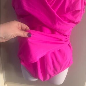 Dive into style with this vibrant pink one-piece bodysuit, featuring a chic wrap design and elegant ruffled details. The sleeveless cut enhances its modern appeal, making it a standout choice for any swim occasion.