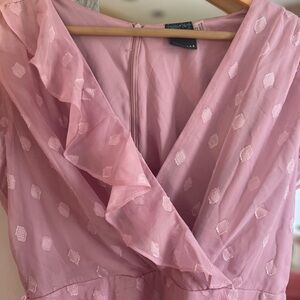 Charming pink wrap dress with ruffled details. Perfect for any occasion.