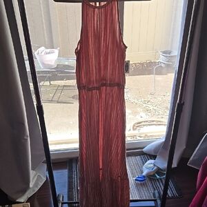 Stylish sleeveless maxi dress with pink salmon and cream stripes. Perfect for casual outings.