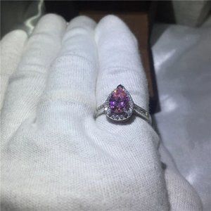 3 carat pear cut pink sapphire ring surrounded with frosted diamonds set in a stamped 925 sterling silver band