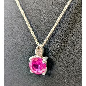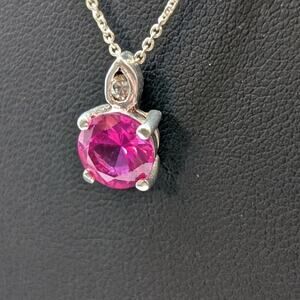 Pink Sapphire Solitaire & CZ Pendant 925 Sterling Silver 18.5" Necklace - 2 Ct Lab Created Gemstone, September Birthstone Jewelry, 5th / 45th Anniversary Gift. Pre-owned, this gorgeous hot pink lab created sapphire pendant is in excellent condition.