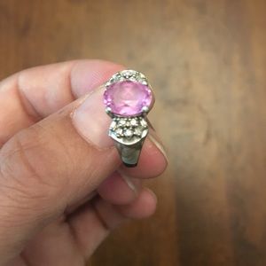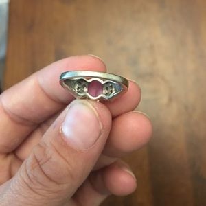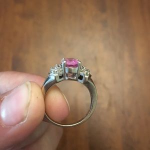 Size 7, 14k white gold band, large pink sapphire, and 3 diamonds on each side. Lightly worn, no broken prongs. Originally from Belden Jewelers