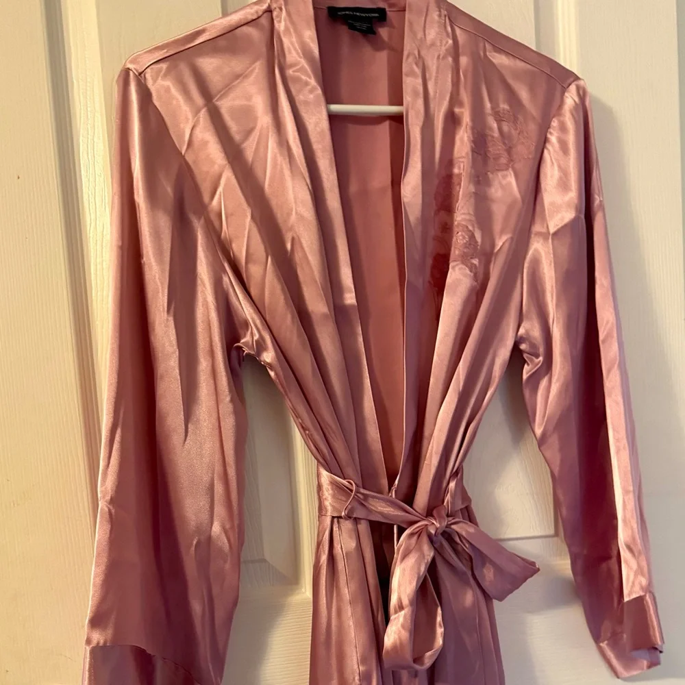 Silky & smooth with beautiful embroidery detail. It has pockets & both an inner & outer tie for the waist