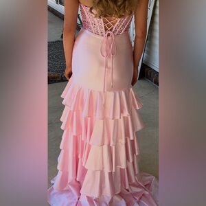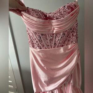 Stunning pink satin dress with elegant ruffles and a stylish slit. Perfect for special occasions.