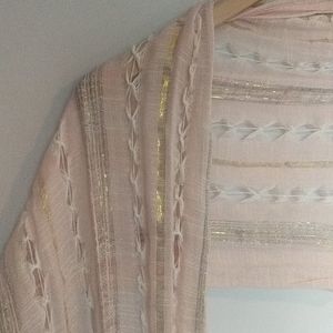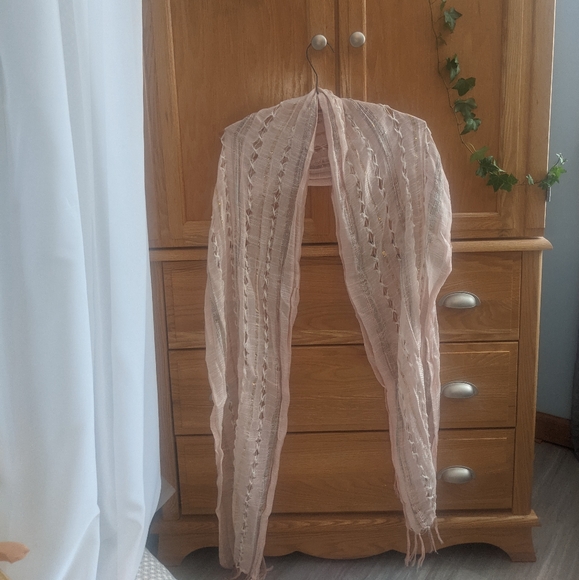 Pale pink scarf with threads of pastel blue, purple, pink, and metallic gold