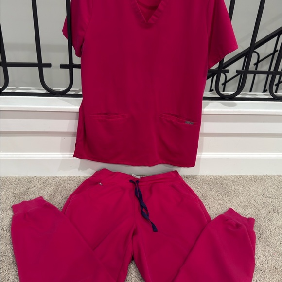 Comfortable hot pink figs scrub set with top and pants. Ideal for medical professionals.