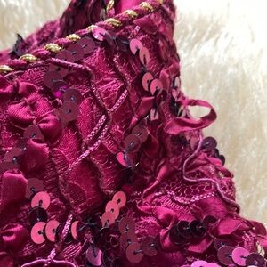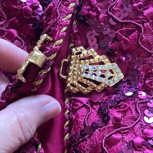 This dazzling pink blazer jacket features all-over sequin embellishments, creating a shimmering effect perfect for special occasions. The classic blazer cut and vibrant color make it a standout piece in any wardrobe. Large heavy clasp in front. Classic 80’s vintage jacket. There are some areas where the ribbon is unstitched. Size and material tag missing so please see pictures for measurements
