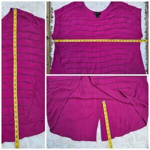 Bright pink georgette fabric w/ black rhinestone beads studs stripes on front. Pullover style, short wide batwing dolman sleeves w/ cuff, rear vent/split hem. Issues noted in photos. Very good preowned condition, overall. Size 22 / 24 by Lane Bryant.
