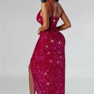 This glamorous pink gown features a shimmering sequin fabric that catches the light beautifully. The bodycon silhouette hugs your curves, while the daring plunge neckline adds an elegant touch. Perfect for a cocktail night out, the dress also includes a high slit for ease of movement.