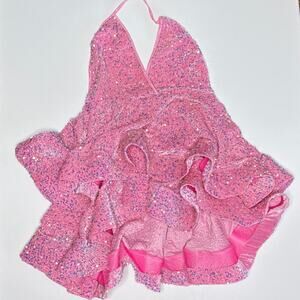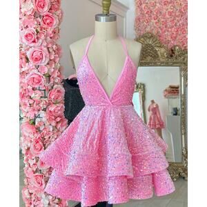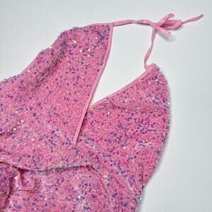 Shine in this stunning pink sequin halter mini dress. Perfect for a night out or special occasion, this dress features a flattering fit and eye-catching sparkle.