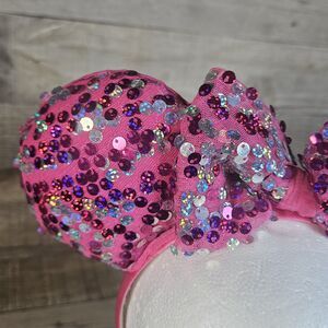 Minnie Mouse ears made with pink sequin fabric. Ears and bow are made from same fabric.
