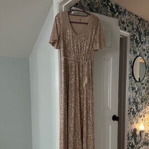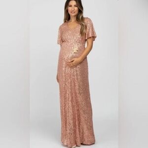 A sequin maternity maxi dress featuring a v-neckline, short sleeves, an adjustable tassel tie at the waist and double lined. New without tags, never worn.