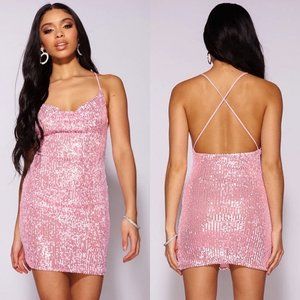 Pink Sequins Sleeveless Cowl Neck Open Back Backless Bodycon Mini Dress