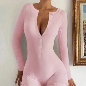 Pink Sexy Women's Half Button Unitard Romper