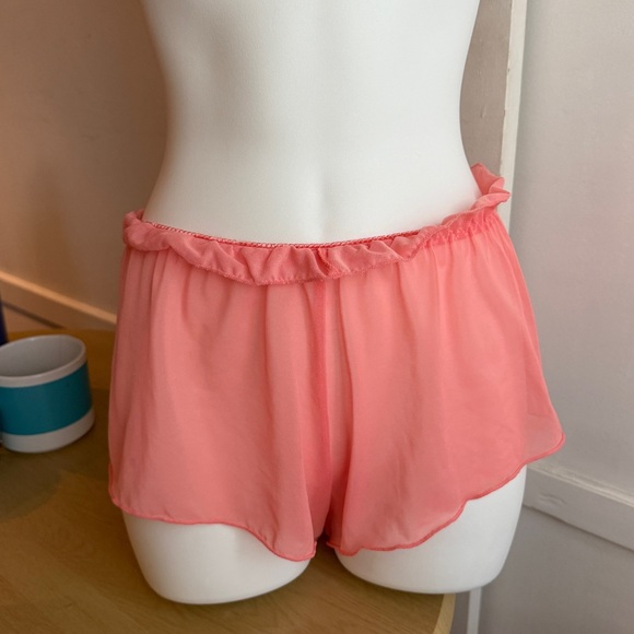 Chic pink sheer shorts with ruffle details. Perfect for a stylish look.