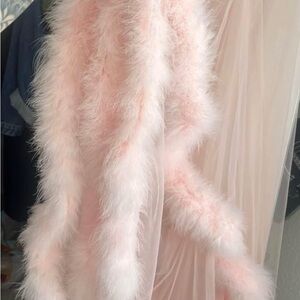 Elegant pink sheer dress with fluffy details. Doesn’t shed. One size fits all (marked as an XXL but I’m a size S and it worked great for me). Would be beautiful for a photoshoot. Stain mark on the end of the robe tie (pictured).